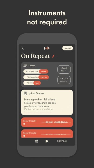 Demo | Songwriting Studio is an innovative application designed to elevate your music creation process. Featuring advanced tools for songwriting, this app assists musicians and lyricists in crafting their melodies and lyrics with ease. Key features include intelligent chord recommendations, a comprehensive virtual instrument library, and seamless integration with popular music software. Perfect for beginners and seasoned songwriters alike, Demo | Songwriting Studio offers a streamlined, efficient workflow for your creative process.